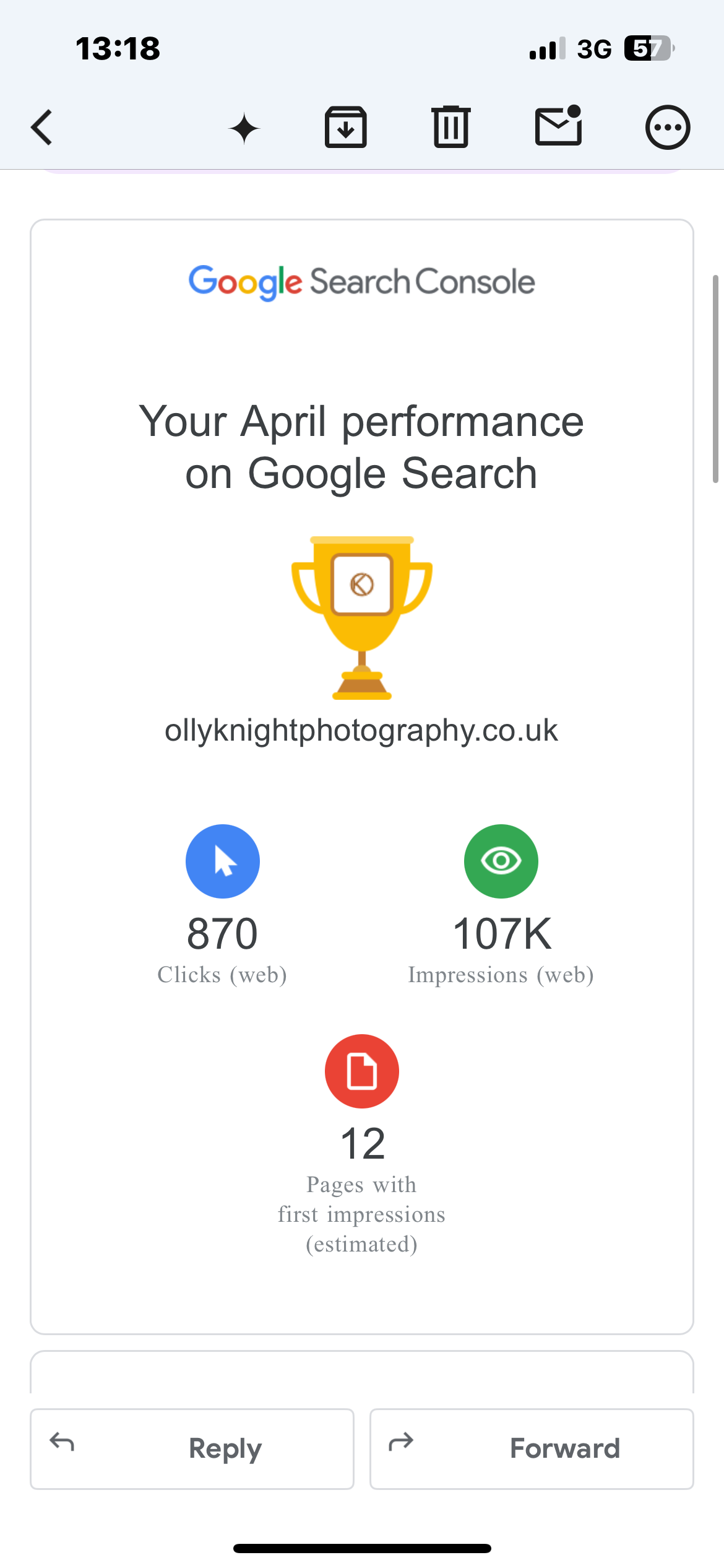 Here’s a snapshot of Google Search Console data from one of my lovely website clients, Olly Knight Photography, who consistently updates his blog with beautifully written, story-led posts about weddings he’s photographed: