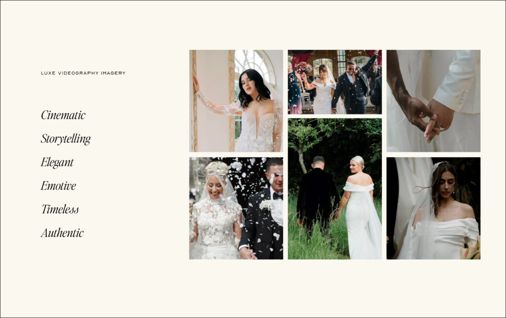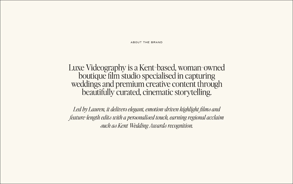 The rebrand began with defining what makes Luxe Videography different. For Lauren, it’s not just about documenting a wedding day — it’s about telling a story that feels authentic, emotive, and deeply personal.